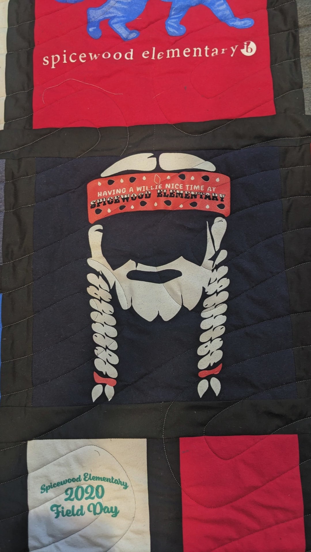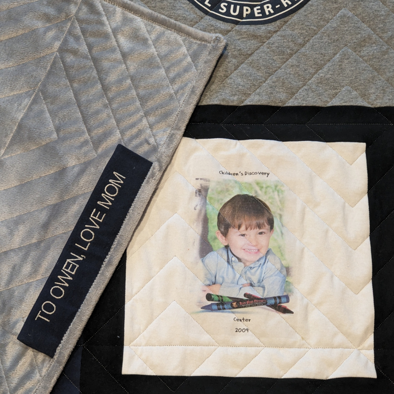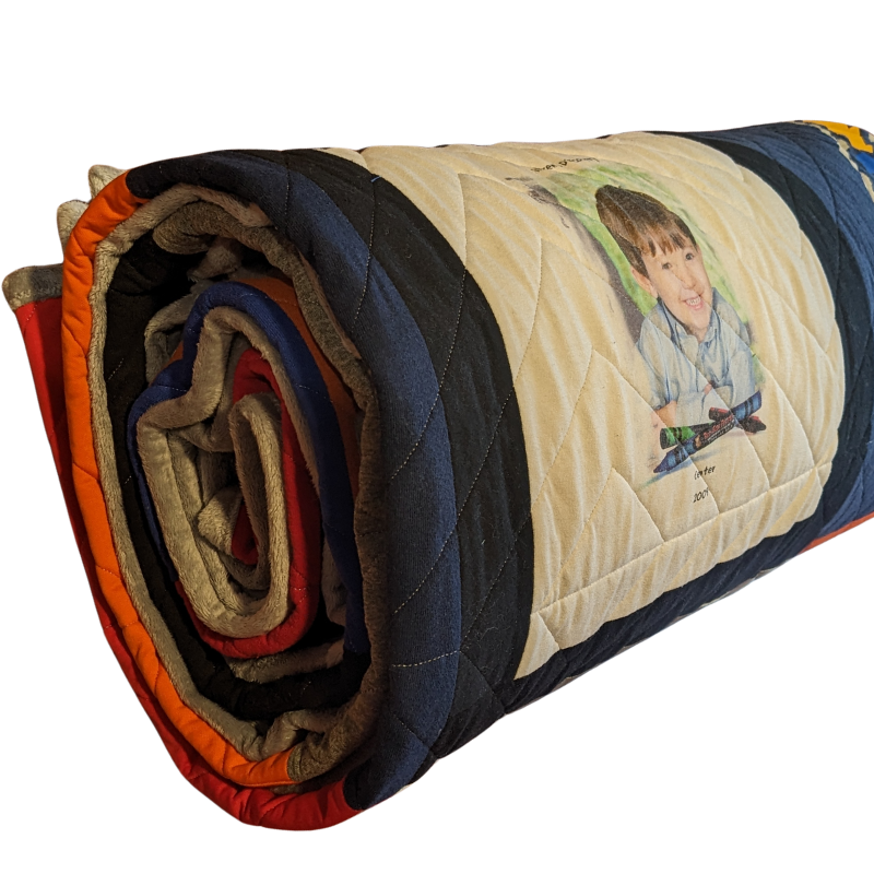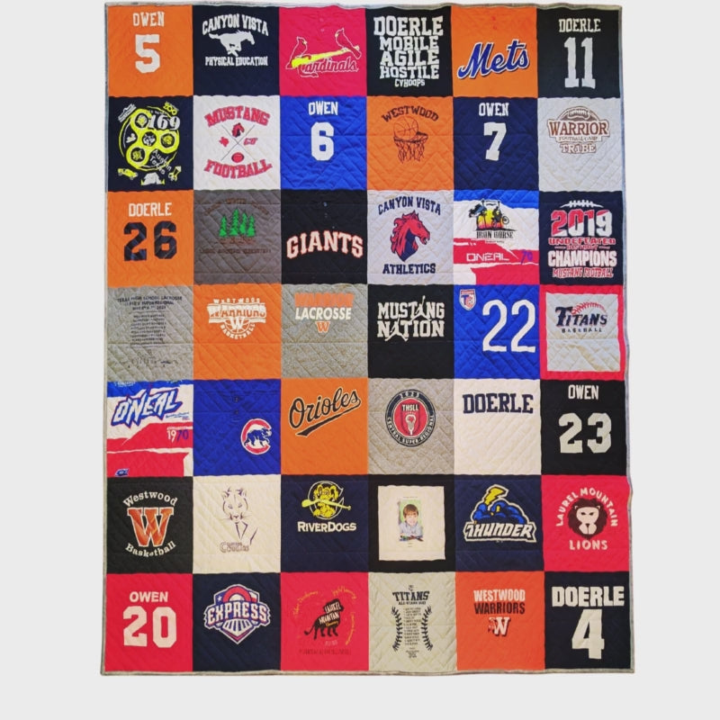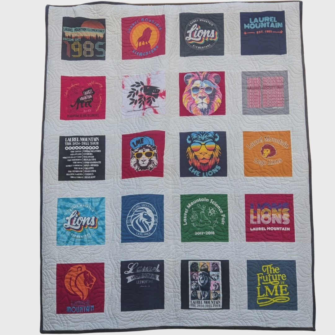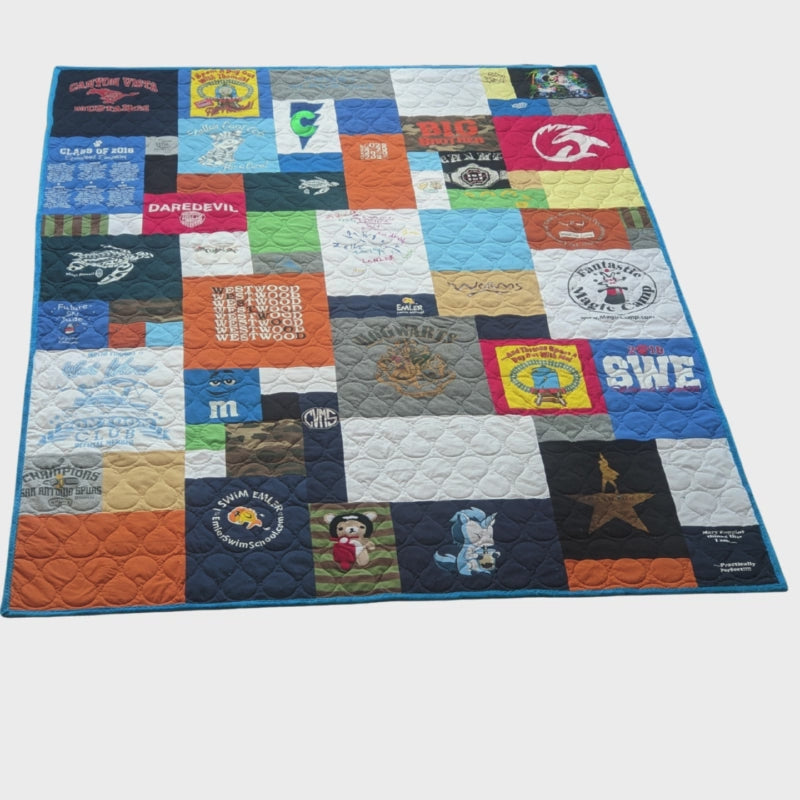 Custom t-shirt quilts are priced at $20 per block. Backing, batting, longarm quilting, and binding are included in the price. Sashing (strips of background fabric separating t-shirts) is available for $2 more per block. Collage style quilts (assorted block sizes placed randomly) are priced by square inch rather than by individual block and are 10 cents per square inch. Collage style quilts are ideal when your t-shirt collection includes a wide range of sizes.